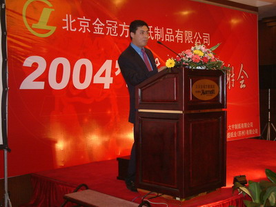 (景華紙業網獨家報道 記者何玲)元月6日,北京金冠方舟紙制品有限公司在北京金域萬豪酒店召開2004年新春客戶答謝會,公司總經理朱勇先生出席大會向各位新老客戶恭祝新春快樂并作了精彩發言。此次答謝會由金冠方舟紙制品有限公司主辦,景華紙業網協辦,支持單位為:金光紙業集團、大宇制紙、泉林集團和金華盛紙業。全國各地的客戶、經銷商等眾多嘉賓參加了答謝會。