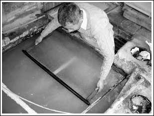 把竹簾放入紙漿池中,準備撈出“雛形紙”