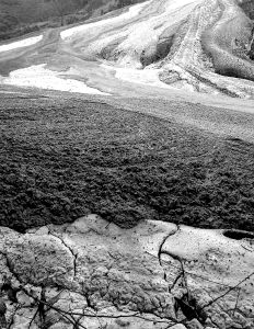 “山”體顏色鮮艷,主要以藍(lán)灰色、白色、棕黃色和黑灰色為主。坡體溝壑縱橫,呈流體狀。山下部的廢渣已經(jīng)干化凝結(jié)。在廢渣的擋墻處,有兩個巨大的涵洞管道。下端的那個管道正在往擋墻下的山溝排水。排出的水呈淺黃褐色。