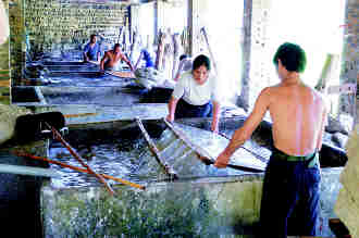 在制作之前,收購來的構皮樹樹皮需要在水中浸泡四十九天