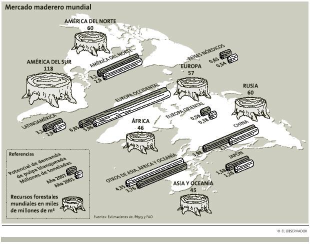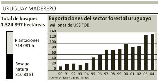 烏拉圭的人工林主要集中在RIVERA、TACUAREMBO、RIONEGRO、PAYSANDU以及東部山地。桉樹(shù)(GLOBULUS和GRANDIS兩個(gè)品種)和松樹(shù)占了80%。GLOBULUS按樹(shù)10年后就可砍伐,而GRANDIS按樹(shù)和松樹(shù)則在生長(zhǎng)15-20年后方可成材。烏拉圭現(xiàn)有的人工林從2006年開(kāi)始可以成片砍伐。