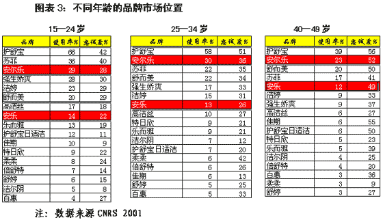 衛生巾不同年齡的品牌市場位置