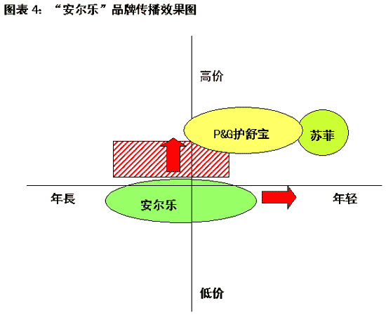 面臨市場內外的全方位競爭,經過審慎調研和精心策劃,恒安集團決定實施品牌差異化戰略,以“安爾樂”子品牌“七度空間”引領市場。“七度空間”子品牌的基本定位是:以速滲、高吸收、抗菌、透氣、纖薄、防側漏、舒爽等年輕女性,尤其是現代都市白領女性所關注的衛生巾產品七方面功能為出發點,幫助她們樹立追求時尚、追求完美的“細節完美主義”的生活觀點,感受作為一個女人被人全方位照顧的喜悅。同時,提煉出“七重防護,全效照顧”的產品核心概念,全方位運用整合品牌傳播手段推動“安爾樂”品牌整體形象提升,將“安爾樂”同中低檔品牌區隔開來,打造成能與“護舒寶”、“嬌爽”等洋品牌抗衡鼎禮的大品牌。(見圖表4)