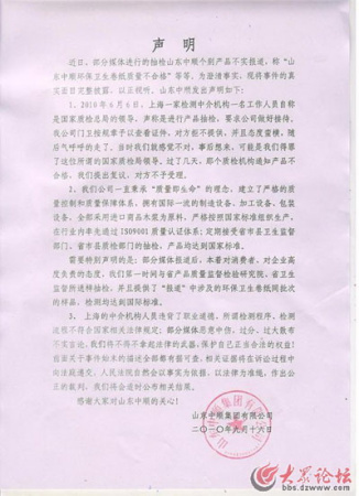 19日上午,記者在大眾網論壇內看到了這條名為“山東中順:我們被惡意中傷!”的帖子,帖子上傳了一張聲明,聲明說“部分媒體進行的抽檢山東中順個別產品不實報道,為澄清事實,將事件的真實面目完整披露,以正視聽。”