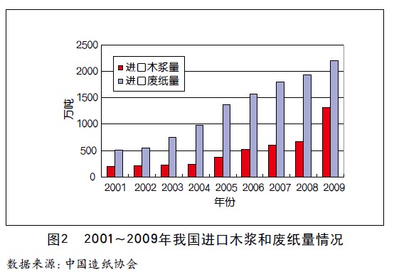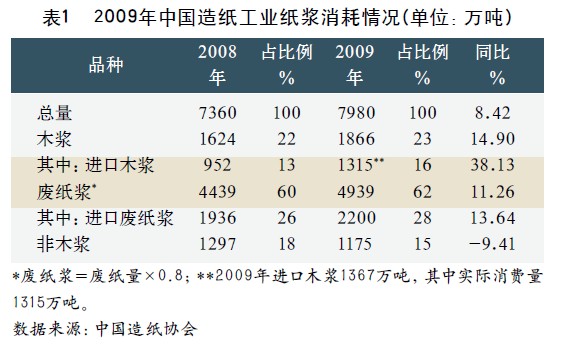 從2001年開始,我國造紙工業(yè)每年的紙漿消費(fèi)量便呈現(xiàn)逐年遞增的趨勢(shì)。以此來支撐不斷擴(kuò)張的造紙產(chǎn)能。據(jù)中國造紙協(xié)會(huì)調(diào)查資料,2009年全國紙漿消耗總量7980萬噸,較上年7360萬噸增長8.42%。