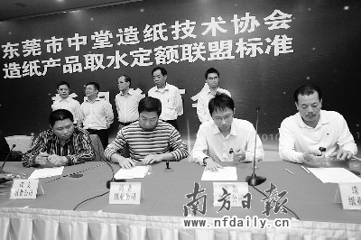 昨日,中堂鎮舉行了“造紙行業取水定額聯盟標準”新聞發布會(上圖,何建文攝),東莞市質監局、經信局、水務局和中堂鎮政府領導,以及市節能降耗重點企業和中堂鎮造紙行業龍頭企業等出席了當天的活動。該聯盟標準說明了“造1噸紙到底有多少噸水”、“用多少噸水才能符合國家標準”等熱點問題,記者從會上獲悉,中堂鎮全力推動節能環保可循環發展,嚴格要求造紙用水標準,該鎮造紙行業用水低于國家標準。