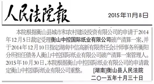然而,2015年11月8日《人民法院報》上刊登的一則破產文書再次將中控國際紙業推上風口浪尖:“根據衡山縣城市和農村建設投資有限公司的申請于2014年12月5日裁定受理衡山中控國際紙業有限公司破產清算一案,2015年10月30日,衡山縣人民法院裁定中控國際紙業有限公司破產重整。”