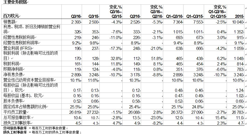 · 經(jīng)營性息稅前利潤為6.93億歐元,同比增長3.0%(2015年同期:6.73億歐元),主要歸因于可變成本的下降。