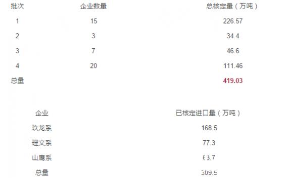 截至目前,環保部固廢管理中心共公示了四批進口名單,合計核定進口量約419萬噸。玖龍、理文、山鷹三大家總計獲得309.5萬噸,占已核定總量的74%。