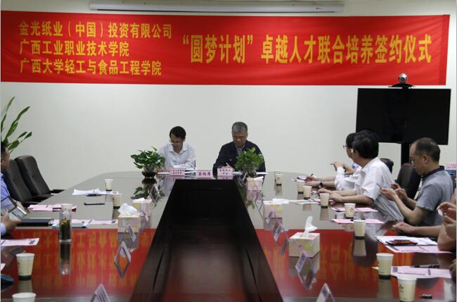 4月23日上午,由金光紙業(中國)投資有限公司(以下稱APP中國)與廣西大學、廣西工業職業技術學院共同推動的“圓夢計劃”卓越人才聯合培養項目在位于欽州的APP旗下企業廣西金桂漿紙業有限公司正式啟動。APP(中國)總部人力資源運營總經理江俊德分別與廣西工業職業技術學院院長韓志剛、廣西大學輕工與食品工程學院院長覃程榮簽署了卓越人才聯合培養合作協議,廣西金桂漿紙業有限公司總經理黃俊彥以及欽州市僑辦、市教育局等單位領導和相關人員共同見證簽約儀式。
