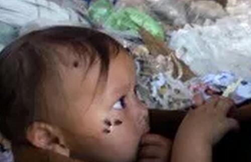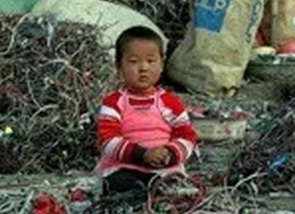 小孩坐在廢舊電線里,臉上、手上,漆黑 在廣東貴嶼的空氣中, 二惡英含量全球最高, 這是一種劇毒化合物。 貴嶼的山曾經(jīng)郁郁蔥蔥, 但已經(jīng)很多年長(zhǎng)不出樹(shù)了。 在汕頭,只要貴嶼人走出去, 大家就能猜到他是哪里人, 因?yàn)樗麄兌紦碛幸豢诤谘馈?/p> 電路板碎裂時(shí)產(chǎn)生的鉛灰, 讓全鎮(zhèn)八成以上的兒童都患有鉛中毒病, 血癌病例高發(fā)。 2010年,導(dǎo)演王久良, 耗時(shí)六年制作了一部紀(jì)錄片, 記錄了中國(guó)山東一個(gè)村莊的日常。 這里的人們以回收洋垃圾為生, 村民也是在沒(méi)有任何防護(hù)措施的情況下, 徒手分揀垃圾。 老太太清理瓶子的時(shí)候, 被一種叫氫氟酸腐蝕到整個(gè)關(guān)節(jié)碳化。 孩子們?cè)诶牙锿嫠#?/p> 日常的玩具, 就是從垃圾堆里找到的醫(yī)療廢品。 他們用針筒吸水喝, 把醫(yī)療手套吹成皮球玩。