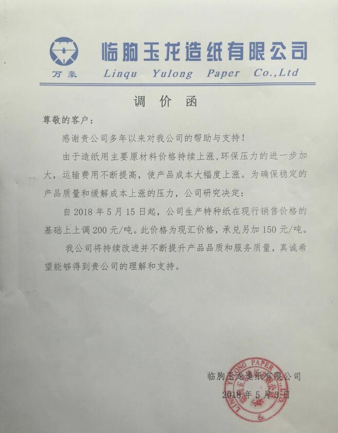 山東臨朐玉龍造紙廠發布特種紙漲價函