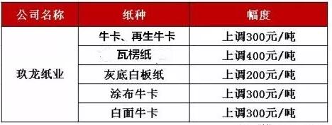 這次的漲價風潮從5月開始,不過10天左右已經形成一股燎原之勢,各大紙廠“遙相呼應”、此方唱罷彼方又起。而就在5月10日,玖龍再次丟出重磅炸彈:瓦楞紙再漲400元/噸!天津玖龍瓦楞紙70g報價為5500元/噸!而不止是玖龍,諸如世紀陽光、港興、亨利等紙廠也在10號上調了300-500元/噸。還有業內人士透露,浙江臺州的瓦楞紙從4月26日到5月10日已漲了1500元噸!漲到今天,原紙價格已令人高攀不起! 玖龍宣布上調瓦楞紙價,幅度為400元/噸