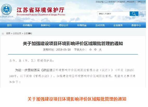 5月18日,江蘇省發(fā)布《關(guān)于加強(qiáng)建設(shè)項(xiàng)目環(huán)境影響評價區(qū)域限批管理的通知》,自區(qū)域限批文件下達(dá)之日起,除民生、環(huán)境保護(hù)基礎(chǔ)設(shè)施項(xiàng)目外,所有建設(shè)項(xiàng)目環(huán)評報(bào)告書(表)(含已進(jìn)入擬審批公示程序的)均暫停審批。