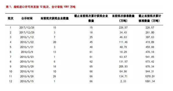 截止目前,66家企業(yè)獲批2018年廢紙進口許可 迄今為止,廢紙進口許可共發(fā)放12批次,累計批準1081萬噸,相比2017年下滑61%。企業(yè)進口廢紙,需先行向環(huán)保部申請進口配額,獲批后方可進口。所以,廢紙進口許可數(shù)量可以認為是廢紙實際進口數(shù)量的天花板。 截止目前,共有66家企業(yè)獲批2018年廢紙進口許可,合計1081萬噸,相比2017年進口許可數(shù)量下滑近61%。