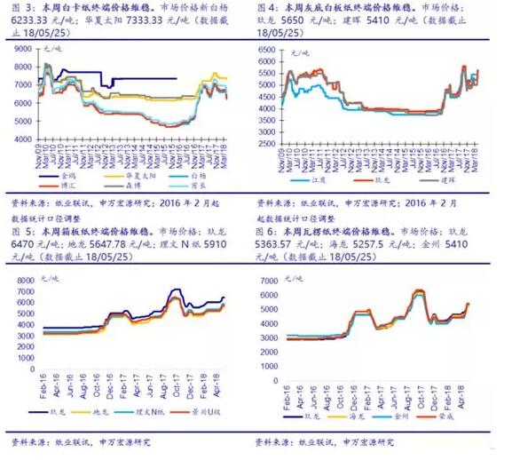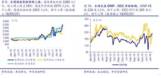 總體來說,上周箱板紙終端均價為5944元/噸,瓦楞紙終端均價為5358元/噸,均持平前一周。箱板紙方面,自海關總署下發緊急文件宣布美廢可報關審批后,下游對于后市行情多持觀望態度,以消耗自身庫存為主,整體采購熱情不高,紙廠整體交投平緩。瓦楞紙市場行情同樣受到美廢放松限制這一新政的影響,市場整體交投略顯清淡;业装装寮垉r格維穩。終端均價為6610元/噸,持平前一周。上周灰底白板紙市場繼續維持前期穩定態勢。終端需求不佳,紙箱廠以及印廠采購熱情不高。紙廠出貨緩慢的情況下,價格暫維持穩定。 受下游需求不旺,廢紙價格穩中有跌影響,上周原紙價格也較為平穩。個別紙企計劃進行停機檢修或已處檢修狀態。周內市場交投氣氛不佳,觀望氣氛較為濃郁,下游包裝廠無較大采購動力,多以隨用隨采、小幅補庫為主。 預判:中國瓦楞箱板紙開工率一直低于93%,2018年后將低于90% 上周申萬宏源還受邀參加了2018RISI(銳思)亞洲紙業峰會,并發表題為《供需皆有新變化,龍頭紙企穩健前行》的主題報告。我們認為2018年造紙新變化在于供給增量將會放量,2018年1-4月造紙行業固定資產投資額同比增長11.8%,將對市場供需結構形成一定沖擊。未來龍頭紙業仍將穩健前行,中小產能被淘汰,龍頭紙廠集中度不斷提升;成本方面,漿紙系公司高紙漿自給率優勢、廢紙系公司廢紙穩定供應渠道優勢構筑龍頭紙企相對成本優勢。 峰會還邀請了全球造紙行業資深專家進行了專題報告,我們將主要觀點梳理呈現如下: 1、2018-2019國內造紙行業需求預判,文化紙需求穩定,包裝紙需求增長:文化紙整體需求不變,其中未涂布化學漿紙小幅增長(+1.6%)、涂布化學漿紙小幅下滑(-0.4%)、新聞紙繼續大幅下滑(-6.1%);原生漿白紙板將持續快速增長(+5%~6%)、再生漿版紙板需求小幅增長(+0%-1%);箱板瓦楞紙需求增長減速(+3.8%)。 2、2018-2019國內包裝紙開工率預判,白紙板提升,箱板瓦楞紙下滑:原生白紙板開工率2017年達到低點80%,2018-2019年受益需求帶動開工率回升,將在2019年達到85%;再生白紙板開工率將延續2013年以來的開工率(低點70%)提升趨勢,2019年同樣達到85%。箱板瓦楞紙行業預計2018-2019年存量產能淘汰分別為250萬噸和410萬噸,但受新增產能投放影響,開工率將有所下降,2018/2019開工率90%/89%。 3、國內外開工率對比:中國開工率明顯低于歐美國家。白紙板:2010年以來北美開工率穩定自90%以上,且在2016年提升至95%,歐洲開工率也穩定在85%以上,2018年將超過90%,而國內白紙板行業開工率在2016年之前一直低于80%。箱板瓦楞紙北美開工率2011年以來持續高于94%且穩步提升,2019年開工率將達到98%;歐洲原生漿紙開工率也維持在95%以上,而中國開工率缺一直低于93%,且在2018年后將低于90%。開工率的不斷提升是供需結構持續改善的表現,將大幅提升紙廠盈利能力:以白紙板為例,國內紙廠成本明顯高于北美和歐洲,但成品紙價格低于兩地區,這主要是因為國內紙廠開工率低,供給大于需求所致。未來伴隨中小紙廠退出,行業份額向大廠集中,國內造紙行業盈利能力將提升。 4、廢紙,美廢是主要來源國,廢紙供給緊張格局將持續:我國外廢主要來自于美國,2017年亞洲(不含日本)廢紙進口總量3050萬噸,我國是廢紙主要進口國,其中來自美國廢紙1530萬噸,占比超過一半。中國禁廢令之后,美國廢紙開始轉向出口亞洲其他國家,2018年1-2月美國對其他亞洲國家出口量增加110%。預計2018年國內廢紙需求總量穩定,但是其中國廢供給難以短期彌補外廢缺口,造成國內廢紙供給持續緊張。廢紙價格的不斷上漲推漲國內箱板瓦楞紙價格,而東南亞又獲得“額外”廢紙供應,2017年以來中國從其他亞洲國家進口箱板瓦楞紙量急劇提升(去年箱板瓦楞原紙進口量的提升主要來自亞洲),未來東南亞進口原紙有可能會對國內原紙市場形成沖擊。 5、關注能源成本,煤改氣帶來能源成本上升:目前與全球對比,中國造紙行業的成本優勢來源之一是能源成本優勢,但是隨著環保趨嚴,“煤改氣”的推進,將會增加紙廠的能源成本。中小紙廠的能源成本的增加,將有效壓縮其盈利空間,加速中小紙廠淘汰。 6、紙漿供給仍緊張,價格將維持高位:由于中國纖維供應緊張,木漿需求將保持強勁,短期看隨著新線逐步達產,木漿供應量增加,加之4-8月歐洲木漿紙需求淡季,紙漿價格可能小幅走弱。但隨著產能擴張放緩,2018年底以及2019年市場趨緊,紙漿價格仍將維持高位。