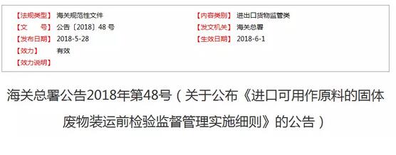 根據《進口可用作原料的固體廢物檢驗檢疫監督管理辦法》,海關總署制定了《進口可用作原料的固體廢物裝運前檢驗監督管理實施細則》,自2018年6月1日起執行。 進口廢物新準則于6月1日起執行,各需進口廢紙的紙企應知曉。 特此公告。 海關總署 2018年5月28日 進口可用作原料的固體廢物裝運前檢驗監督管理實施細則 第一章總則 第一條為加強和規范對進口可用作原料的固體廢物(以下簡稱“廢物原料”)裝運前檢驗和裝運前檢驗機構的監督管理,根據《中華人民共和國進出口商品檢驗法實施條例》《進口可用作原料的固體廢物檢驗檢疫監督管理辦法》,制定本細則。 第二條本細則適用于進口廢物原料裝運前檢驗活動、裝運前檢驗機構的備案管理,以及相關的監督管理工作。 第三條海關總署負責對裝運前檢驗實施監督管理,對裝運前檢驗機構實施備案管理,并對其活動依法實施監督管理。 第四條海關總署不予指定檢驗機構從事進口廢物原料裝運前檢驗。 第五條海關總署對進口廢物原料裝運前檢驗機構實施備案管理。第三方檢驗機構在從事廢物原料裝運前檢驗業務之前,應當向海關總署提出備案申請。 第六條海關總署對裝運前檢驗機構實施風險預警及快速反應管理。 第七條裝運前檢驗機構應當遵守中國相關法律法規和海關總署的有關規定,以第三方身份獨立、公正地開展進口廢物原料裝運前檢驗工作,并對其所出具的裝運前檢驗證書的真實性、準確性負責。 第八條裝運前檢驗機構及其關聯機構不能申請或者代理申請供貨商注冊登記,不能從事廢物原料的生產和經營活動。 第二章裝運前檢驗 第九條裝運前檢驗是指在進口廢物原料運往中國境內之前,依照中國法律法規、國家環境保護控制標準和國家技術規范的其他強制性要求,以及裝運前檢驗規程等的要求,由裝運前檢驗機構對其進行檢驗、監裝和施加封識,然后出具裝運前檢驗證書的行為。 第十條裝運前檢驗機構應當在進口廢物原料的境外裝貨地或者發貨地,按照中國國家環境保護控制標準、相關技術規范的強制性要求和裝運前檢驗規程實施裝運前檢驗。 第十一條根據裝運前檢驗工作質量風險特性與管理要求,裝運前檢驗機構應當在其合法注冊所在的國家或地區開展裝運前檢驗活動。 第十二條裝運前檢驗機構應當具備與其實施裝運前檢驗活動相適應的規模、檢驗人員數量和檢驗設施設備,確保經其檢驗的廢物原料符合中國法律法規、國家環境保護控制標準和國家技術規范的其他強制性要求。 第十三條裝運前檢驗機構應當分別設置檢驗、授權簽字等關鍵崗位,保持相互獨立,同時制定任職的專業背景條件,持續接受業務培訓和教育,確保檢驗員、授權簽字人熟悉掌握與廢物原料有關的中國法律法規、國家環境保護控制標準和國家技術規范的其他強制性要求,以及相關的管理規定。 第十四條裝運前檢驗機構應當依據本細則第十條的規定,制定適合本機構情況的裝運前檢驗工作程序或者作業指導書,規范現場裝運前檢驗活動。 第十五條裝運前檢驗機構應當依靠自身檢驗能力,完整地實施檢驗、監裝和施加封識等工作程序,并對其工作質量負全責,不得委托其他機構、組織或人員實施。 第十六條裝運前檢驗機構應當以適當方式,真實、完整、可追溯地記錄其實施的裝運前檢驗活動過程,并妥善貯存、保管檢驗原始記錄,至少保存5年。 第三章備案管理 第十七條裝運前檢驗機構應當提前向海關總署備案,并提交以下材料: (一)備案申請書; (二)經公證的所在國家(地區)合法注冊的第三方檢驗機構資質證明; (三)固定的辦公地點、檢驗場所使用權證明材料;辦公場所和經營場所平面圖,能全面展現上述場所實景的視頻或者5張以上照片; (四)ISO/IEC17020體系認證證書彩色復印件及相關質量管理體系文件; (五)從事裝運前檢驗的廢物原料種類; (六)裝運前檢驗證書授權簽字人信息及印簽樣式; (七)公司章程。 提交的備案申請材料應當使用中文或者中英文對照文本。 第十八條備案申請人在準備好申請材料后,將全套材料提交海關總署,以海關總署收到的書面申請資料為準。 第十九條海關總署在收到備案申請書面材料后,根據下列情況分別處理: (一)備案申請材料不齊全,或者不符合要求的,當場或者5個工作日內一次性告知備案申請人需要補正的全部內容,要求備案申請人須在30天內補正完畢; (二)備案申請材料齊全、符合要求的,或者備案申請人補正材料后,經審查材料齊全、符合規定要求的,予以受理; (三)逾期未補正的,終止辦理備案; (四)未按照要求全部補正備案申請材料或者補正后備案申請材料仍不符合要求的,不予受理。 第二十條海關總署自受理裝運前檢驗機構備案申請之日起10個工作日內組成專家組,按照《進口可用作原料的固體廢物裝運前檢驗機構備案審核記錄表》的要求,審核申請人資格、申請材料的完整性、符合性等情況。 專家組應當在審核工作結束后作出審核結論,向海關總署提交審核報告。 第二十一條海關總署自收到審核報告之日起10個工作日內作出是否同意備案的意見。審核合格的,同意備案,簽發《進口可用作原料的固體廢物裝運前檢驗機構備案證書》;審核不合格的,不予備案。 第二十二條海關總署自受理備案申請之日起20個工作日內作出同意備案或不予備案的意見。專家組審