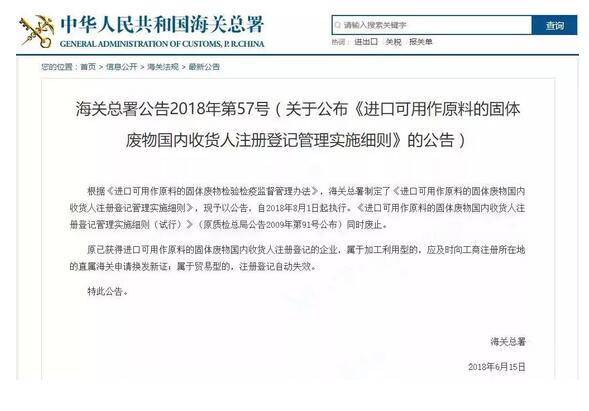 6月15日,海關總署發布今年第57號文件,根據《進口可用作原料的固體廢物檢驗檢疫監督管理辦法》,海關總署制定了《進口可用作原料的固體廢物國內收貨人注冊登記管理實施細則》,自2018年8月1日起執行。《進口可用作原料的固體廢物國內收貨人注冊登記管理實施細則(試行)》(原質檢總局公告2009年第91號公布)同時廢止。