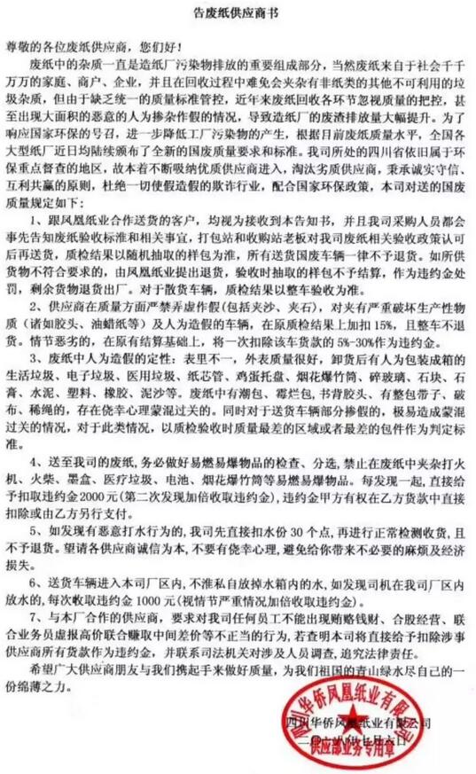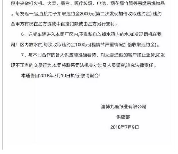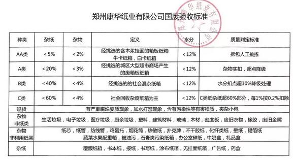 越來越嚴:陽光紙業、永豐余等6家紙廠發布廢紙收購新標準 山東昌樂世紀陽光紙業 濰坊大環國廢管理通告尊敬的供應商您好:針對目前國廢存在的一些質量問題,現將國廢來貨質量問題及公司規章制度重新強調如下,請各供應商嚴格遵守。 1、嚴格控制國廢中的加重紙類、生漿及生料類、不可用纖維類、非纖維類物質等垃圾,如超過10%則扣點50%,超過15%則扣點100%。 2、來貨中嚴禁夾帶易燃易爆品如未燃盡的煙花、爆竹等,若有夾帶一經查實罰款2000元。 3、為加強對省外廢紙原料監管力度,堵塞原料收購管理漏洞,如省內原料謊報省外原料的,一經查實罰款10000元并沒收整車原料。 4、為做好安全消防工作,請各供應商叮囑司機,必須配齊滅火器材;嚴禁穿拖鞋、背心,著裝必須整齊。為節約進場時間,盡量自己配帯滅火帽,對違反規定者嚴禁進廠。 5、各供應商根據自己的來貨質量報對來貨種類,對于亂報種類造成降級的車輛,將出廠重新排隊。 6、送貨車輛進入我司廠內后,不準私自放掉水箱內的水;如發現司機在我司廠內放水行為,每次罰款5000元。 7、嚴禁故意摻假,一年內第一次故意摻假給予貨物降級并罰款5000元;第二次故意摻假給予貨物降級并罰款10000元;第三次故意摻假給予沒收貨物,打入“黑名單”并罰款50000元;行為極其惡劣的直接予以沒收整車貨物。 8、要嚴格遵守已簽訂的反商業賄賂協議書,如發現不正當的交易行為,我公司將聯系司法機關對涉及到的人員進行調查,按協議書相關規定進行處理望廣大供應商嚴格控制來貨質量,遵守我公司的各項管理規定以上通告自2018年7月10號執行,敬請配合。 濰坊大環再生資源有限公司原料部 2018年7月9號 江蘇揚州永豐余 揚州永豐余紙廠紙芯管驗收標準: 1、允許芯管比例,紙芯管重/整車廢紙重量小于5%--允收; 2、紙芯管重/整車廢紙重量大于5%,小于8%則計扣3%; 3、紙芯管重/整車廢紙重量大于8%,紙器紙收下,紙芯管全部退貨; 4、發現夾帶(隱藏)整車退貨。 (注意:揚州永豐余紙業前兩天剛發布了一版國廢新標準,這是第二次發布的新標準,可見紙廠對廢紙質量的整治力度之大) ——自2018年7月10日起執行!特此通知 山東淄博九鹿紙業
