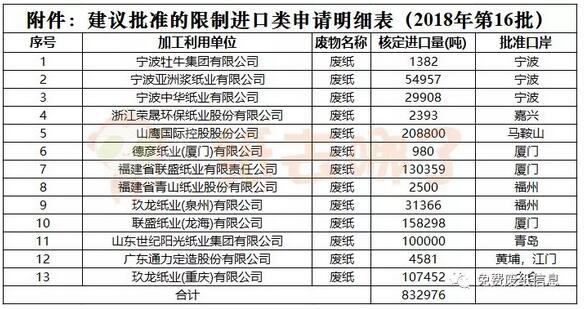 7月16日,環(huán)保部固體廢物與化學品管理技術中心公示了2018年第16批限制進口類產品明細,共有13家造紙企業(yè)獲批,總核定量為83.2976噸。