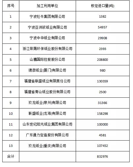 1家新紙廠獲得核準(zhǔn)量,目前共有67家紙廠獲批廢紙進(jìn)口許可 值得一提的是,在本批廢紙進(jìn)口許可名單中,出現(xiàn)了兩家新紙廠,即廣東通力定造股份有限公司和寧波牡牛集團(tuán)有限公司。自4月份以后就沒有新紙廠獲得核準(zhǔn)量,而本次新紙廠的出現(xiàn),則意味著將有更多符合條件的紙廠申請(qǐng)廢紙?jiān)S可成功。 據(jù)統(tǒng)計(jì),截止目前,已有67家紙廠獲得廢紙進(jìn)口許可。以下為具體名單: 山西省:1家 山西強(qiáng)偉紙業(yè)有限公司 天津市:1家 玖龍紙業(yè)(天津)有限公司 江西省:1家 江西理文造紙有限公司 安徽省:1家 山鷹國(guó)際控股股份公司 河北省:1家 玖龍紙業(yè)(河北)有限公司 遼寧省:1家 玖龍紙業(yè)(沈陽)有限公司 重慶:2家 玖龍紙業(yè)(重慶)有限公司 重慶理文造紙有限公司 江蘇省:2家 玖龍紙業(yè)(太倉(cāng))有限公司 江蘇理文造紙有限公司 山東省:3家 山東華泰紙業(yè)股份有限公司 山東世紀(jì)陽光紙業(yè)集團(tuán)有限公司 泰山石膏有限公司 福建省:4家 福建省聯(lián)盛紙業(yè)有限責(zé)任公司 福建省青山紙業(yè)股份有限公司 聯(lián)盛紙業(yè)(龍海)有限公司 德彥紙業(yè)(廈門)有限公司 廣東省:12家 東莞建暉紙業(yè)有限公司 東莞金洲紙業(yè)有限公司 東莞理文造紙廠有限公司 東莞市泰昌紙業(yè)有限公司 東莞市潢涌銀洲紙業(yè)有限公司 東莞順裕紙業(yè)有限公司 廣東理文造紙有限公司 玖龍紙業(yè)(東莞)有限公司 東莞市金田紙業(yè)有限公司 廣州造紙股份有限公司 森葉(清新)紙業(yè)有限公司 廣東通力定造股份有限公司 浙江省:38家 浙江金龍紙業(yè)有限公司 浙江山鷹紙業(yè)有限公司 玖龍紙業(yè)(泉州)有限公司 平湖榮成環(huán)保科技有限公司 浙江景興紙業(yè)股份有限公司 浙江景興板紙有限公司 杭州華勝紙業(yè)有限公司 浙江道勤紙業(yè)有限公司 浙江華遠(yuǎn)紙業(yè)有限公司 杭州東大紙業(yè)有限公司 浙江金東紙業(yè)有限公司 杭州三星紙業(yè)有限公司 浙江文豐紙業(yè)有限公司 杭州通達(dá)紙業(yè)有限公司 杭州遠(yuǎn)大紙業(yè)有限公司 杭州金民源紙業(yè)有限公司 浙江眾意紙業(yè)有限公司 杭州富陽正華紙業(yè)有限公司 浙江遠(yuǎn)大紙業(yè)有限公司 杭州海晨紙業(yè)有限公司 浙江榮晟環(huán)保紙業(yè)股份有限公司 杭州豐達(dá)紙業(yè)有限公司 杭州富陽華隆紙業(yè)有限公司 杭州富陽鑫源紙業(yè)有限公司 杭州藍(lán)鳥紙業(yè)有限公司 杭州瑞星紙業(yè)有限公司 蘭溪市華圣紙業(yè)有限公司 臺(tái)州森林造紙有限公司 浙江東大紙業(yè)有限公司 浙江富陽華天紙業(yè)有限公司 浙江恒昇紙業(yè)有限公司 浙江三星紙業(yè)股份有限公司 浙江萬信紙業(yè)有限公司 浙江涌金紙業(yè)有限公司 杭州華勝紙業(yè)有限公司 寧波牡牛集團(tuán)有限公司 寧波亞洲漿紙業(yè)有限公司 寧波中華紙業(yè)有限公司
