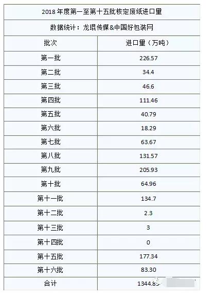 截止目前,2018年一共審批了16批建議批準(zhǔn)的限制進(jìn)口類申請(qǐng)明細(xì)表,總核定廢紙進(jìn)口量為1344.85萬噸。具體如下: