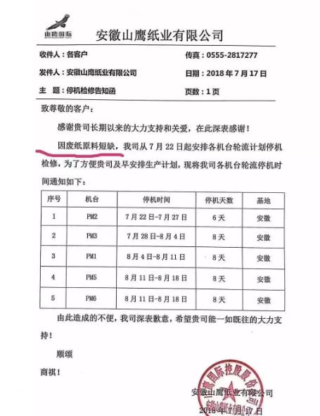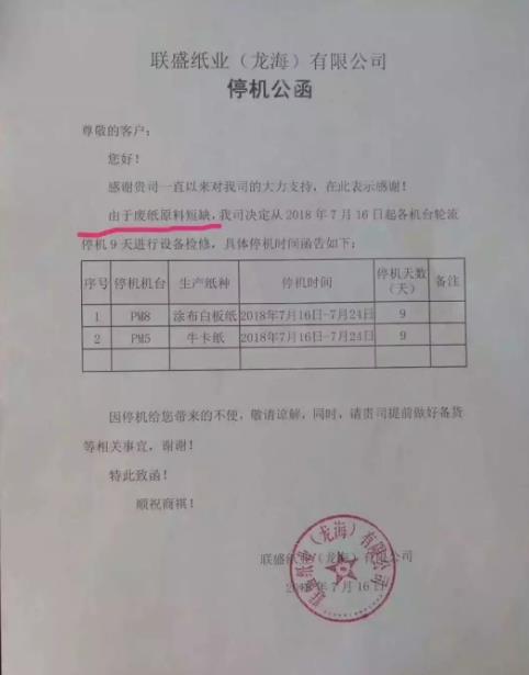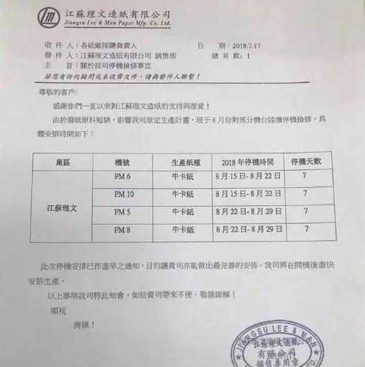 繼東莞玖龍、太倉玖龍、福建聯盛三大紙廠發布停機通知后,龍海聯盛、安徽山鷹、江蘇理文、東莞理文、廣東理文四家紙廠也加入了停機隊伍,涉及17臺紙機,停機時長在4-13天不等。 短短兩天時間,國內造紙行業便有7家大型紙廠發布停機檢修計劃,一共涉及35臺紙機,涵蓋瓦楞紙、牛卡紙、灰底白板紙、涂布白板紙、文化紙等多個紙種。紙廠如此大面積的停機,背后究竟是什么原因在作祟? 7月15-16日,東莞玖龍、太倉玖龍、福建聯盛三大紙廠宣稱因廢紙原料短缺,將進行停機檢修,震驚業內。詳見: 福建聯盛:7月16日起,對生產高強瓦楞原紙的PM33機臺停機檢修7天。 東莞玖龍:7月20日起,生產牛卡瓦楞紙、灰底白板紙、文化紙的9臺機組停機檢修7-11天。 太倉玖龍:7月18日起,生產瓦楞紙、灰底白、文化紙、牛卡紙的8臺機組停機檢修7天。 不過一兩天時間,龍海聯盛、安徽山鷹、江蘇理文、東莞理文、廣東理文四家紙廠也加入了停機隊伍,涉及17臺紙機,停機時長在4-13天: 龍海聯盛:7月16日起,生產涂布白板紙和牛卡紙的兩臺紙機停機檢修9天。