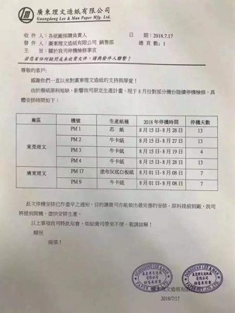 東莞理文:8月15日起,生產芯紙、牛卡紙的4臺紙機停機檢修4-13天。 廣東理文:8月1日起,生產涂布灰底白板紙、牛卡紙的2臺紙機停機檢修7天。