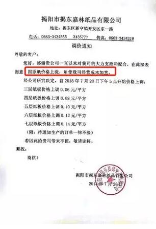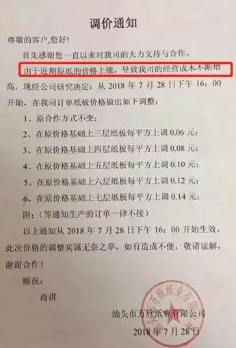 汕頭四萬欣紙業(yè)有限公司:由于近期原紙價格上漲,導(dǎo)致公司經(jīng)營成本不斷增高,決定自2018年7月28日下午16:00開始,紙板價格做出如下調(diào)整: 1.原合作方式不變; 2.在原價格基礎(chǔ)上三層紙板每平方上調(diào)0.06元; 3.在原價格基礎(chǔ)上四層紙板每平方上調(diào)0.08元; 4.在原價格基礎(chǔ)上五層紙板每平方上調(diào)0.10元; 5.在原價格基礎(chǔ)上六層紙板每平方上調(diào)0.12元; 6.在原價格基礎(chǔ)上七層紙板每平方上調(diào)0.14元。