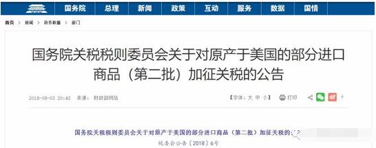 已經(jīng)持續(xù)一段時(shí)間的中美貿(mào)易戰(zhàn)又生變化,中國方面逐步反擊。8月3日,財(cái)政部網(wǎng)站發(fā)布了《國務(wù)院關(guān)稅稅則委員會(huì)關(guān)于對原產(chǎn)于美國的部分進(jìn)口商品(第二批)加征關(guān)稅的公告》,用以反擊此前美國對中國2000億美元商品加征25%關(guān)稅的措施。  反擊!中國對原產(chǎn)于美國的5207個(gè)稅目進(jìn)口商品加征關(guān)稅,涉及貿(mào)易額600億 2018年8月3日,財(cái)政部發(fā)出通知《國務(wù)院關(guān)稅稅則委員會(huì)關(guān)于對原產(chǎn)于美國的部分進(jìn)口商品(第二批)加征關(guān)稅的公告》,全文如下:
