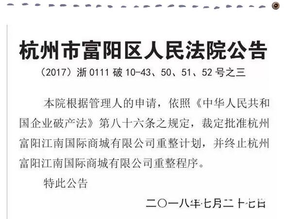 7月27日,富陽法院批準江南國際商城公司重整計劃,并予以依法公告(見8月1日富陽日報第11版)。