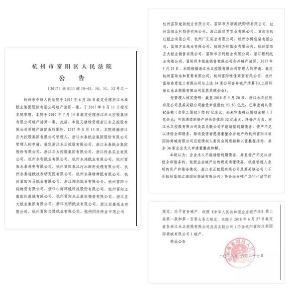36家公司宣告破產 根據管理人查明的資產負債情況,永正控股及其關聯公司符合企業破產法破產清算的規定,富陽法院于2018年6月27日裁定宣告浙江永正控股有限公司、浙江永泰紙業集團股份有限公司、浙江正大控股集團有限公司、浙江傳承實業有限公司、杭州永利紙業有限公司、杭州永鴻紙業有限公司、杭州富陽永泰熱電有限公司、杭州富陽春江污水回用處理有限公司、杭州永泰造紙技術研究院有限公司、杭州永森特種紙有限公司、杭州富陽萬馬紙業有限公司、浙江翔龍紙業有限公司、杭州富陽中翔物資有限公司、浙江山海環境科技股份有限公司、杭州富陽永正廢舊物資有限公司、浙江正大紙業集團有限公司、浙江光明紙業有限公司、浙江宏盛紙業有限公司、杭州富陽文博紙業有限公司、杭州國佳紙業有限公司、杭州富陽建新紙業有限公司、富陽市方新廢紙購銷有限公司、杭州富陽正和物資有限公司、浙江新世界實業有限公司、富陽市錢旺紙業有限公司、杭州廣匯實業有限公司、杭州永博包裝有限公司、富陽方正紙業有限公司、杭州萬和紙業有限公司、杭州富陽正大紙業銷售有限公司、富陽市萬利紙業有限公司、浙江銀利紙業有限公司、富陽同豐紙張銷售有限公司、杭州富陽永和貿易有限公司、杭州富陽唯佳商貿有限公司、杭州富陽春意化工有限公司等36家公司破產,并予以公告(見7月9日富陽日報第5版)。