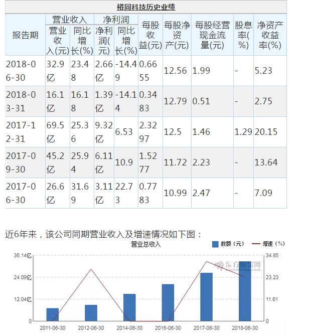裕同科技8月23日最新公布的2018年中報顯示,其營業收入32.9億元,同比增長23.48%;歸屬于上市公司股東的凈利潤2.66億元,同比下降14.49%。基本每股收益0.6655元。公司最新分配方案為不分配不轉增。 近年來,公司的業績情況如下表所示: