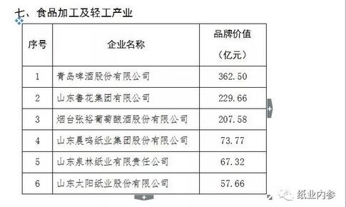 9月7日,由山東省質監局聯合省發展改革委、省經濟和信息化委、省科技廳、省住房城鄉建設廳等八部門及濟南市人民政府共同舉辦全省“質量月”活動啟動儀式在濟南舉行。會上發布2018年度山東省制造業百家高端品牌培育企業名單以及制造業高端品牌培育企業品牌價值50強。 在食品加工及輕工產業類中,山東晨鳴紙業集團有限公司,山東泉林紙業有限責任公司和山東太陽紙業股份有限公司入選,三家的品牌價值分別為73.77億元、67.32億元和57.66億元。