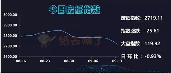 今日國廢調整情況綜述: 2018年09月13日最高下調100元/噸。廢紙指數2719.11,環比下調0.93%。 華東地區廢紙價格下調30-100元/噸。 華南地區廢紙價格下調30-50元/噸。 華中地區廢紙價格下調50元/噸。 北部地區廢紙價格下調30-50元/噸。 西部地區廢紙價格下調50元/噸。 今日各地區國廢調整情況 華東地區 山東: 山東東營華泰紙業,箱板紙價格下調30-50元/噸。 山東壽光鴻源(原鑫源紙業)紙業,廢紙價格下調50元/噸。 山東聊城中治銀河紙業,廢紙價格下調50元/噸。 山東德州平原匯勝紙業,廢紙價格下調50元/噸。 山東壽光魯麗紙業,廢紙價格下調50元/噸。 山東濰坊匯勝紙業,廢紙價格下調50元/噸。 山東昌樂世紀陽光紙業,B、C、紙管下調50元/噸。 山東棗莊豐源中科紙業,廢紙價格下調50元/噸。 山東鄒城太陽宏河紙業,AA、A級下調100元/噸,B級下調80元/噸。 山東泰安泰和紙業,箱板紙下調50元/噸。 山東天地緣紙業,廢紙價格下調50元/噸,C級不變。 江蘇: 江蘇淮安國圣紙業,廢紙價格下調50元/噸。 江蘇丹陽長豐紙業,廢紙價格下調50元/噸。 江蘇徐州中興(建平)紙業,廢紙價格下調50元/噸。 江蘇無錫榮成紙業,廢紙價格下調50元/噸。 江蘇鹽城雙勝紙業,廢紙價格下調50元/噸。 江蘇建湖鳳程紙業,廢紙價格下調30元/噸。 江蘇太倉玖龍紙業,黃板類下調50元/噸。 江蘇宿遷上善紙業,廢紙價格下調50元/噸。 江蘇揚州永豐余紙業,廢紙價格下調50元/噸。 江西: 江西萍鄉柯美紙業,廢紙價格下調80元/噸。 福建: 福建漳州三星紙業,廢紙價格下調50元/噸。 福建泉州玖龍紙業,黃紙下調50元/噸。 安徽: 安徽兆隆紙業,廢紙價格下調50元/噸。 華南地區 廣東: 廣東佛山金盛聯合紙業,廢紙價格下調50元/噸。 廣東中山聯合鴻興紙業,廢紙價格下調30元/噸。 廣東中山永發紙業,廢紙價格下調30元/噸。 廣東東莞旭豐紙業,廢紙價格下調50元/噸。 廣東東莞建航紙業,廢紙價格下調50元/噸。 廣東東莞金田紙業,紙皮、坑卡下調50元/噸。 廣東東莞金洲紙業,廢紙價格下調50元/噸。 廣東東莞玖龍紙業,黃紙皮下調50元/噸。 廣東東莞建暉紙業,9月13日開始,B級暫停收購。 華中地區 河南: 河南太康龍源紙業,廢紙價格下調50元/噸。 河南許昌宏偉紙業,廢紙價格下調。 湖北: 湖北荊州祥興紙業,廢紙價格下調50元/噸。 湖北松滋市榮成環保紙業,廢紙價格下調50元/噸。 湖北武漢金鳳凰紙業,廢紙價格下調50元/噸。 北部地區 河北: 河北唐山樂亭張氏紙業,廢紙價格下調30元/噸。 河北唐山玉田順發紙業,廢紙價格下調50元/噸。 河北秦皇島昌黎興昌紙業,廢紙價格下調50元/噸。 河北唐山玉田森信紙制品(原昌泰紙業),廢紙價格下調50元/噸。 河北保定鼎泰紙業,廢紙價格下調50元/噸。 河北永新玖龍紙業,箱板紙價格下調50元/噸。 河北邢臺柏鄉華興紙業,通貨暫停收貨。 遼寧: 遼寧撫順琥珀紙業,廢紙價格下調50元/噸。 遼寧沈陽玖龍紙業,箱板紙價格下調50元/噸。 天津: 天津玖龍紙業,箱板紙價格下調50元/噸。 西部地區 四川: 四川瀘州金田紙業,廢紙價格下調50元/噸,書本不變。 山西: 山西壽陽強偉紙業,廢紙價格下調50元/噸。 山鷹、理文、玖龍廢紙收購價格情況 山鷹紙業 浙江嘉興山鷹(吉安)紙業(09月12日起):A級3000、B級2970、C級2930、D級2830、E級2520、書本2710、辦公用紙2940、小花2610、大花2460(元/噸) 安徽馬鞍山山鷹紙業(09月12日起):機械打包電器廠紙(A級)3020,一級紙(B級)打包2970,超市紙(C級)打包2890,小超市紙(D級)打包2810,二級紙(E級)打包2610,純書本紙打包2700,書報紙打包2650(元/噸) 福建漳州山鷹紙業(09月12日起):A級(純黃板紙)2920,B級(黃板80%以上大超市紙)2870,C級(黃板60-80%以上小超市紙)2790,D級(黃板40-60%以上大統紙)2650,E級(黃板20-40%統貨)2500,黃板紙里面書本紙含量超過30%以上的降為書本紙,2250(元/噸) 理文紙業 江蘇常熟理文紙業(09月12日起):B級2670,C級2540(元/噸) 江西九江理文紙業(09月12日起):一級紙2820,普紙2500(元/噸) 廣東東莞理文紙業(9月12日起):一級紙3000,大統紙2680,統紙2530,一級辦公室紙2740,頁子紙A2690,頁子紙B2590,二白小花2540,小花2340(元/噸)外省廢紙供應商憑當天高速憑證可享受30元/噸的運費補貼。請各位盡量用鐵絲打包。 重慶理文紙業(09月02日起):一級2850,普紙2450(元/噸)注意:云南、貴州地區價格有差別。 玖龍紙業 江蘇太倉玖龍紙業(09月13日起)黃板類下調50元/噸。甲級牛皮紙3350,掛面紙3080,灰黃板2540,國廢A級紙3040,國廢B級紙2990,國廢C級紙2910,國廢D級紙2830,廢雜紙2040,紡線管2250,彈絲管1970,國廢紙芯/回購廢紙芯1660,辦公廢白紙/單面覆膜白芯/黃芯卡紙2000,無膜白芯/黃芯卡紙(單面印刷)2160,純白雙膠紙邊2850,純白統貨(雙膠紙60%、白卡銅板紙40%)2750,純白卡銅版紙2650,辦公廢白紙/一級白2970,辦公廢白紙/書本紙2680,混合白廢紙2630,辦公廢白紙/小花2680,辦公廢白紙/大花2380,廢舊報紙3600(元/噸)注:客戶不同,略有差異。 福建泉州玖龍紙業(09月13日起)黃紙下調50元/噸。A級紙價格2960,B級紙價格2910,C級紙價格2860,D級紙價格2710,坑紙價格2560,混合白廢紙2780,工廠(二白)小花2950,頁子紙2980(元/噸) 廣東東莞玖龍紙業(9月13日起)黃紙皮下調50元/噸。A級3050,B級3000,C級2950,D級2700,坑紙2700,混合純白紙3010,頁子紙2930,工廠小花2810,小花卡紙2700,社會小花2650,書本紙2650,混花2570(元/噸) 四川樂山玖龍紙業(09月12日起):國廢箱板紙A級2820,國廢箱板紙B級2760,國廢