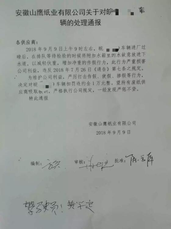 9月9日,安徽山鷹紙業有限公司關于對供應商違規作假,增加凈重的車輛處理通報,并對違規車輛扣罰違約金一萬元。