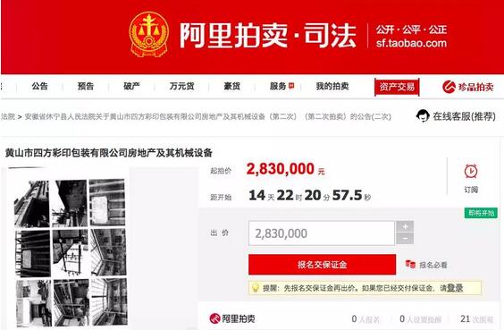 2018年10月24日至10月25日,安徽省休寧縣人民法院將對黃山市四方彩印包裝有限公司房地產及其機械設備進行公開拍賣,起拍價283萬元。
