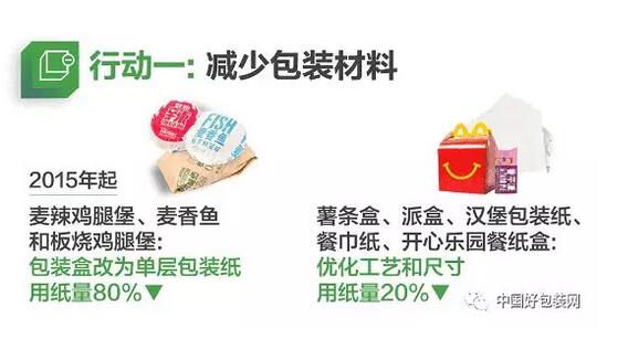 2015年,麥當(dāng)勞中國(guó)相繼取消麥辣雞腿堡、麥香魚(yú)以及板燒雞腿堡的包裝盒,改為單層包裝紙,減少了相關(guān)產(chǎn)品包裝近80%的用紙量。