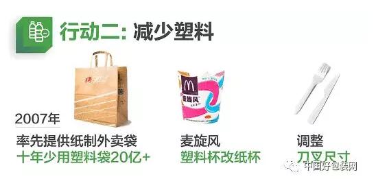 而早在2007年,麥當(dāng)勞中國(guó)就率先提供紙制外賣(mài)袋,十年來(lái)累計(jì)減少超過(guò)20億個(gè)塑料袋。此外,所有餐廳還更換了麥旋風(fēng)塑料杯、調(diào)整了刀叉尺寸,以減少塑料的使用。