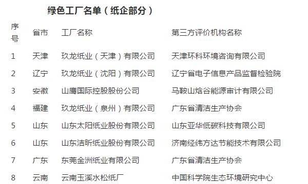 為持續(xù)打造綠色制造先進(jìn)典型,引領(lǐng)相關(guān)領(lǐng)域工業(yè)綠色轉(zhuǎn)型,加快推動(dòng)綠色制造體系建設(shè),工業(yè)和信息化部開展了第三批綠色制造名單推薦工作。經(jīng)申報(bào)單位自評(píng)價(jià)、第三方評(píng)價(jià)機(jī)構(gòu)評(píng)價(jià)、省級(jí)工業(yè)和信息化主管部門評(píng)估確認(rèn)及專家論證、公示等環(huán)節(jié),確定了第三批綠色制造名單,共計(jì)391家企業(yè)被評(píng)為綠色工廠,其中包括了山鷹、玖龍、太陽等8家紙企,詳情如下表所示: