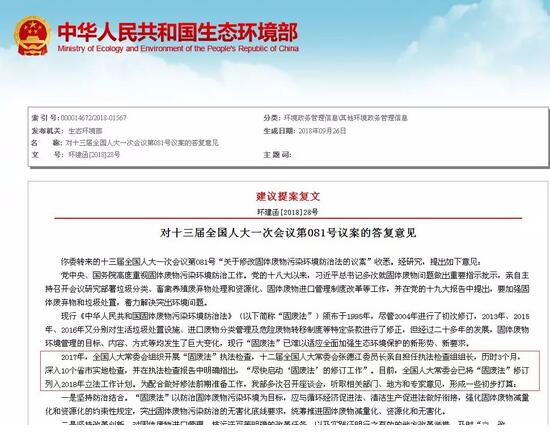 在一個月之前,生態環境部又對全國人大一次會議“關于修改固體廢物污染環境防治法的議案”給出了答復意見,認為現行《固廢法》已難以適應全面加強生態環境保護的新形勢、新要求,全國人大常委會已將《固廢法》修訂列入2018年立法工作計劃,并對關于修改固體廢物污染環境防治法的具體建議表示贊同。