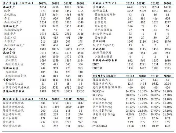 數(shù)據(jù)來(lái)源:卓創(chuàng)資訊,東吳證券研究所 上半年公司匯兌損失約0.23億,隨著人民幣貶值趨勢(shì)持續(xù),預(yù)計(jì)全年匯兌盈虧平衡。 預(yù)計(jì)18-20年裕同科技營(yíng)收87.7億元、112.2億元、140.4億元(+26.3%、+27.9%、+25.1%),歸母凈利9.6億元、12.5億元、16.4億元(+3.0%、+30.3%、+31.2%),但預(yù)估客戶拓展不達(dá)預(yù)期,原材料價(jià)格上漲。 裕同科技三大財(cái)務(wù)預(yù)測(cè)表: