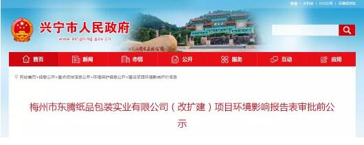 導語:廣東省梅州市興寧市人民政府于12月24日發布了東騰紙品包裝實業有限公司項目環境影響報告表,現已進入審批前公示。該項目投資1.1元,可年產瓦楞紙板7000萬平方米、紙箱1500萬套。