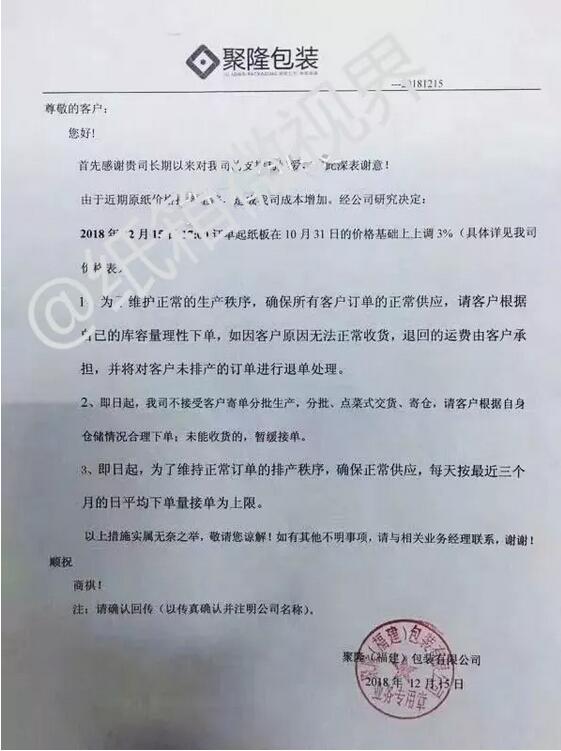 12月份因原紙暴漲,又有3家紙板廠發布漲價函,目前,紙板漲價函已增至21張,多漲3%,部分上漲100元/噸,另有部分漲1.7元/平方!77張原紙、紙板漲價函滿天飛,國廢上漲情緒下原紙、紙板漲價還將繼續,紙箱廠頂不住了!! 杭州三星紙業有限公司:12月21日起,灰板紙出廠價統一上漲100元/噸(未交付的訂單也在漲價范圍內)。到期貨款未付清一律停止發貨。 溫州鴻馬包裝有限公司:12月20日上午11:00起,所有預付款和月結客戶價格在11月5日標準價基礎上上漲。細瓦二層瓦楞紙板上調0.05元/平方,細瓦三層紙板上調0.05元/平方。 宿州龍發包裝有限公司:12月19日17:30接單起(以單到款到為準)所有紙板價格在原折扣上上調3個點。 據小編不完全統計,除以上新增的3家紙板廠的漲價函外,不到10天,已有18家紙板廠發布漲價通知。 換句話說,目前,紙板漲價函已增至21張。紙板多漲3%,部分上漲100元/噸,另有部分漲1.7元/平方!