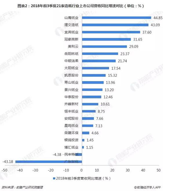 而從2018年前三季度造紙行業內企業的業績表現來看,相較于2017年同期出現了明顯下滑。具體來看,由于行業龍頭玖龍紙業未披露最新財務數據,所以僅對其余21家公司進行分析。在營收方面,明豐特紙、廣東甘化兩家公司同比出現下滑;凈利潤表現更糟,有8家公司凈利潤出現同比下滑,數量占比超過了1/3,利潤下滑企業中更是包括了晨鳴紙業和博匯紙業等營收體量較大的公司。因此,總體來看,2018年前3季度,我國造紙企業業績出現頹勢,發展面臨一定的困境,而這主要是因為原材料供給收緊和下游需求不振所致。