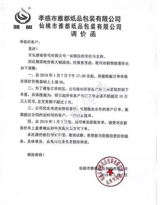 孝感市雅都紙品包裝有限公司/仙桃市雅都紙品包裝有限公司 自2019年1月7日17:30下單起,紙板訂單在現有基礎上上調5%。即日起所有客戶當日下單金額不能超過10萬元人民幣,且交貨期不超過3天。