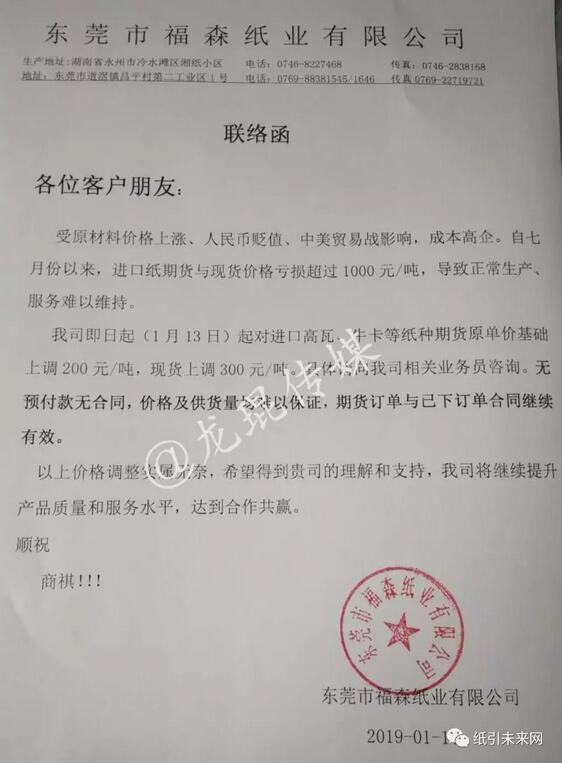 山東天和紙業有限公司:近期我公司持續受原材料、能源等多種因素影響,生產成本升幅較大,為確保貴我雙方互共贏,產品品質持續穩定,經公司董事會研究決定:自2019年1月13目起,我司生產的低定量文化用紙:本白雙面膠版印刷紙及薄冊紙在原價格上調100元/噸,高白和深黃的雙面膠版及薄冊紙在原價格上調200元/噸。