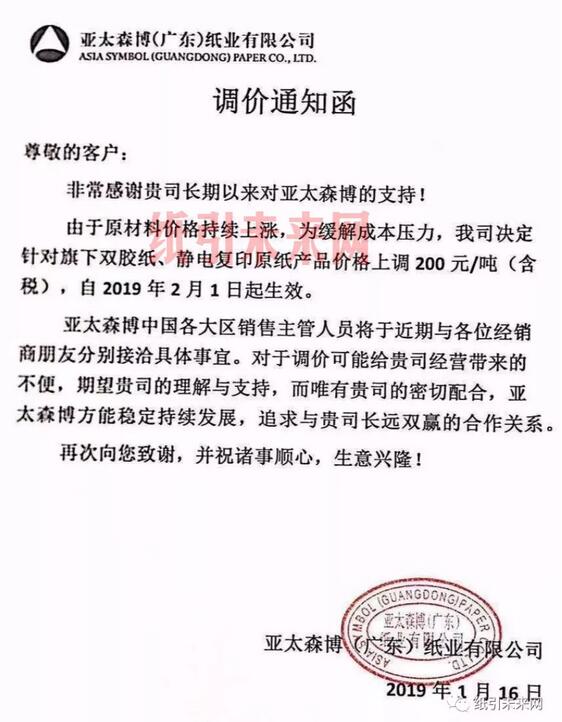 亞太森博(廣東)紙業有限公司:由于原材料價格持續上漲,為緩解成本壓力,我司決定針對旗下的全線品牌復印紙及代加工品牌價格上調100元/噸(含稅),自2019年2月1日起生效。