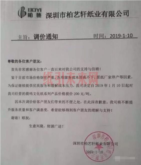 深圳市柏藝軒紙業有限公司:鑒于目前市場價格倒掛嚴重,各項服務成本居高不下、原紙廠家停產等因素為保證繼續提供優質服務和緩解成本壓力,我司決定自2019年1月10日起對我可經營的晨鳴文化紙系列產品價格提價200元/噸。