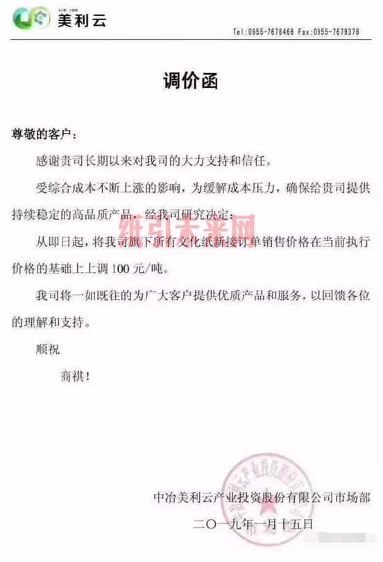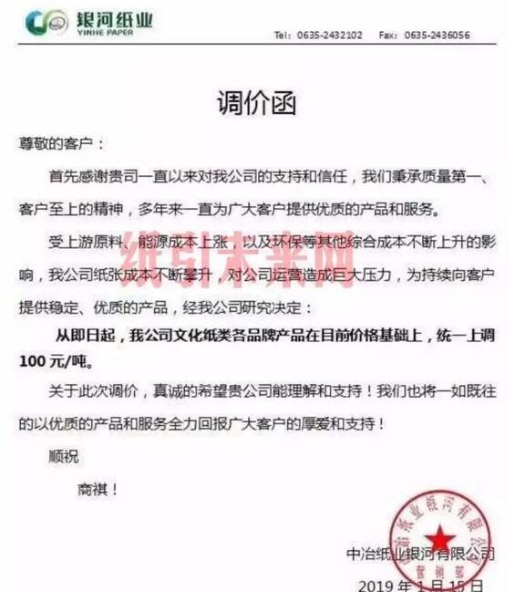 山東天和紙業有限公司:近期我公司持續受原材料、能源等多種因素影響,生產成本升幅較大,為確保貴我雙方互共贏,產品品質持續穩定,經公司董事會研究決定:自2019年1月13目起,我司生產的低定量文化用紙:本白雙面膠版印刷紙及薄冊紙在原價格上調100元/噸,高白和深黃的雙面膠版及薄冊紙在原價格上調200元/噸。